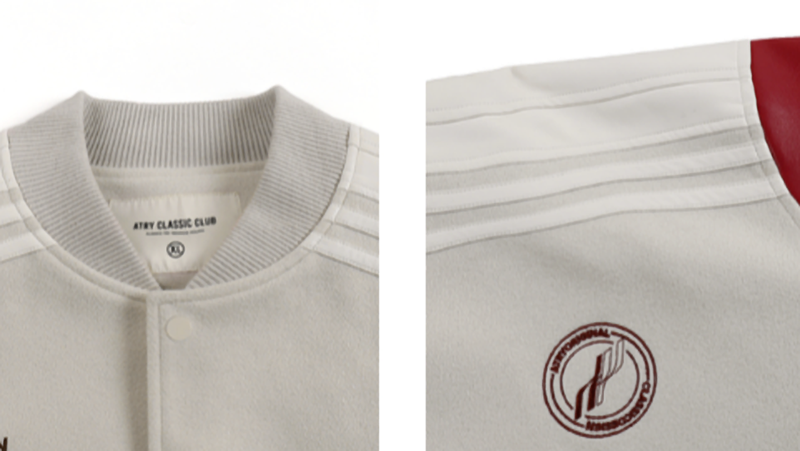 レトロスプライスドベースボールジャケットは、伝統的なデザインを洗練された現代の感性で再解釈した一着です。